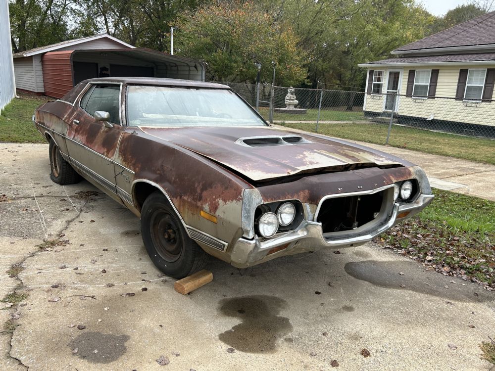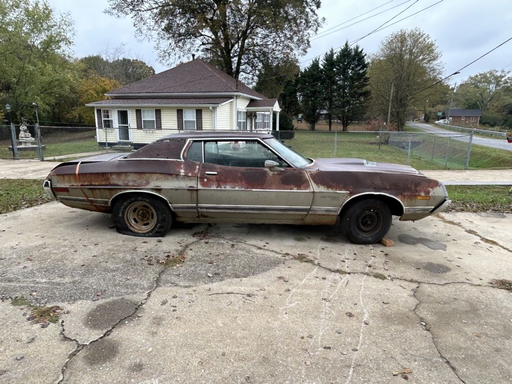 One of 289 72 Formal Roof N code Gran Torino Sports built. Frame is solid. Most other areas will need rust repair. Bottom side of hood is gone. Roof is surprisingly decent considering it had a vinyl top. Only rust holes are on back passenger side corner of roof. Does NOT include any seats. Engine was rebuilt, according to previous owner. Includes intake manifold, radiator, condensor, compressor, carburetor, power steering pump. Asking $1500. Located in north Georgia.