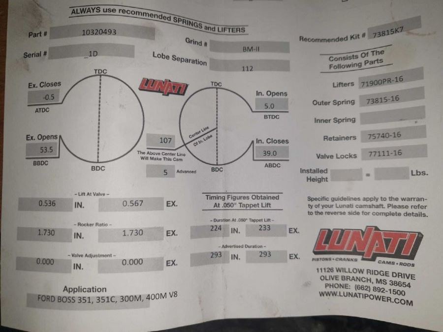 regarding the cam lift and the heads being set up properly, my worry is not the rockers and hardware but the springs and retainers being able to allow the added lift over stock that the Lunati cam brings. you can't just slide a performance cam in and magic happens, the springs need to be checked for bind clearance at max lift or there will be trouble. i looked up the previous Comp cam that cam in the 4V, it's a 268H, this cam CAN slide in with no special parts or checking so there's no indication that anything has been done to the original stock heads to provide for additional lift over stock. was the Comp 268H cam bad, why was it removed? i would've left the 4V engine in as-is running condition so as not to compile a laundry list of what-if's. then after the engine is running as it should, then start doing changes.