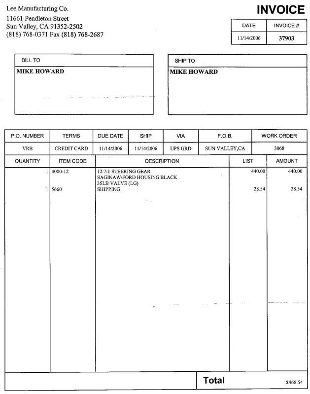 The invoice from Lee MFG caught me off a little bit bacause it is dated 11/14/2006, and it was for $470.00 not $400.00.