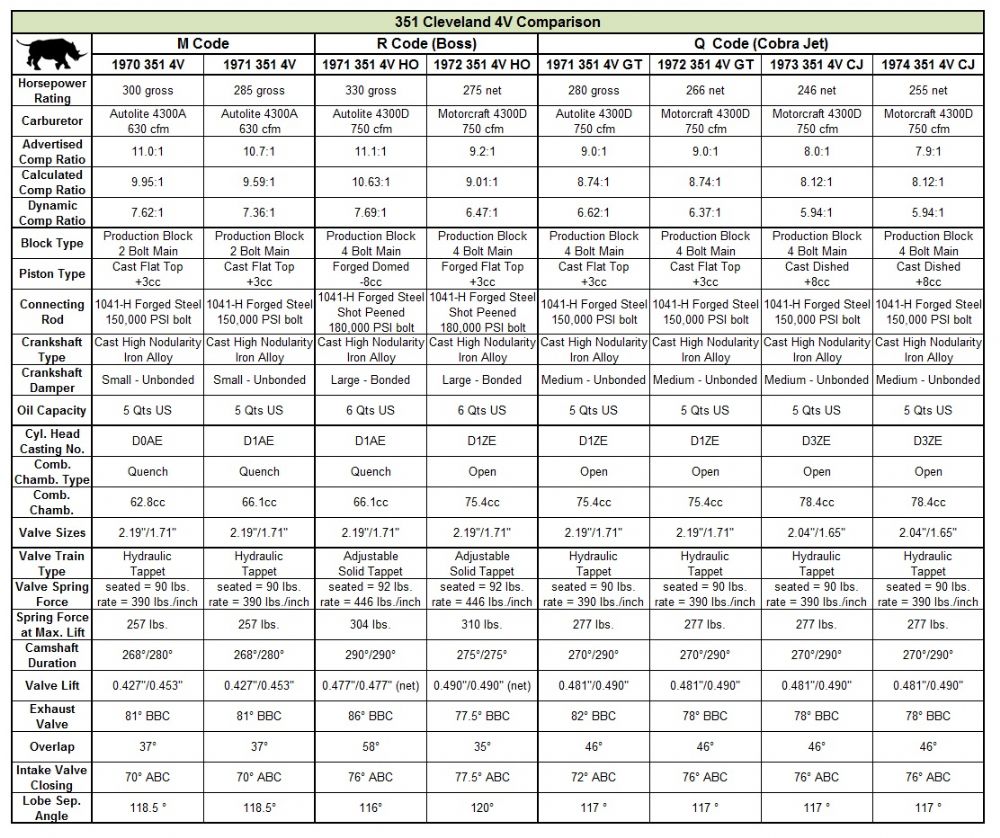 I know most Ford fans probably already know this- The R-code was reserved to Mustangs 68-72, Cougars 68-70, Torinos and Cyclones 68-70. The 68-70 R-codes were the 428CJ-RamAir, The 71 R-code Mustang was the Boss 351, and the last gasp for the R-code was the 72 351HO, which was a slightly detuned Boss 351.. It was not a separate model like the Boss 351- the 72 R-code engine was available in any body style.. The 69-70 Q-codes were non-ram air 428CJ cars. From late 71-74(I think)- the lower compression Q-code 351CJ replaced the M-code 351-4V Cleveland, which appeared in 1970 Mustangs, Cougars, Torinos, and Montego/Cyclones.